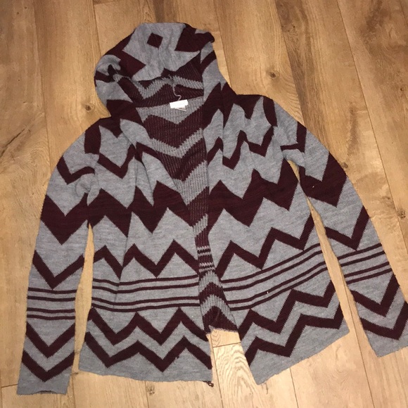 Maroon and grey print cardigan with hood
