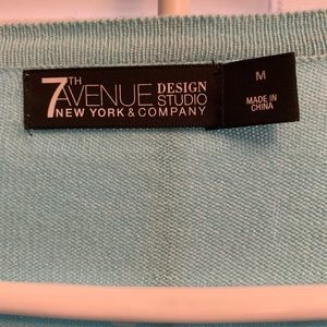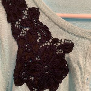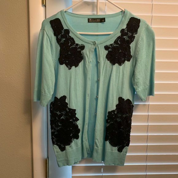 Light teal cardigan with beautiful flower overlay in navy. Great used condition- no rips or stains.