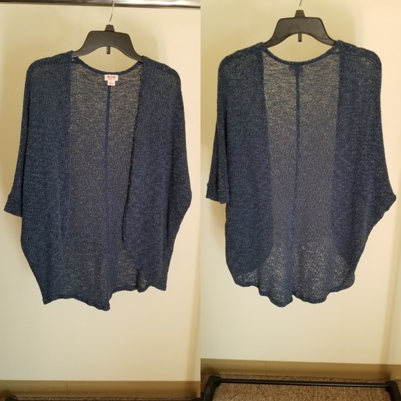 Gently used dark blue cardigan. Very breathable fabric and lightweight. It does cover your butt and is a little flowy. The sleeves come to right above your elbow.