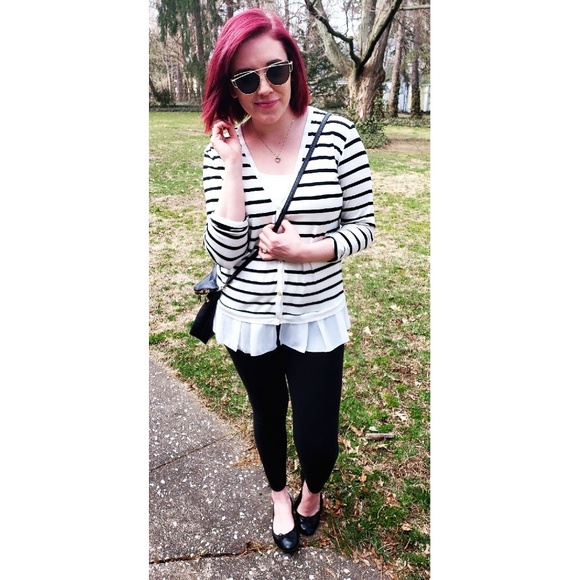 White v-neck cardigan with black stripes and sheer peplum bottom