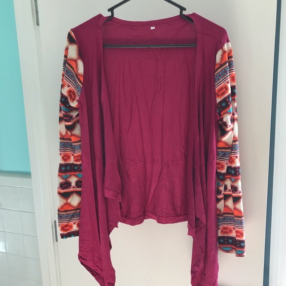 Never worn. Pink cardigan with tribal sleeves. The sleeves were too small for my arms.