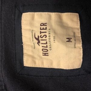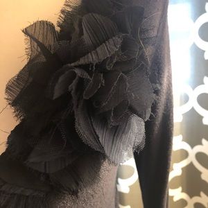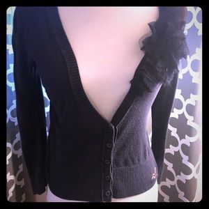 Navy blue half button cardigan with flower detail on one side. This is a shorter sweater in length. This is a medium and is fitted