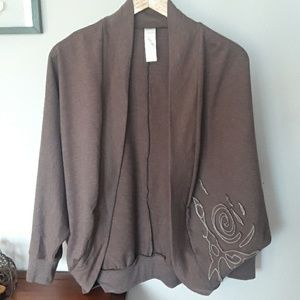 Very attractive brown cardigan with cream applique on one side. Maternity friendly but not maternity. Size is L - XL. 26.5" length. 69% cotton, 40% polyester. Never worn, smoke free home.