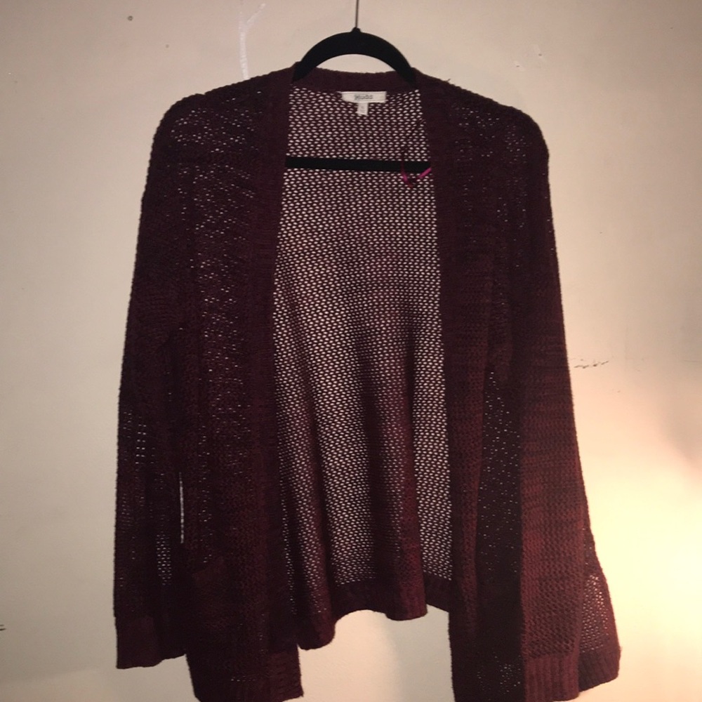 A knitted cardigan maroon has pockets