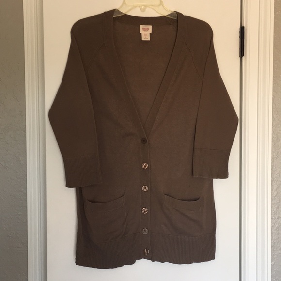 Mocha cardigan, size L, 3/4 length sleeves, button front. 29” from back neck to back hem.