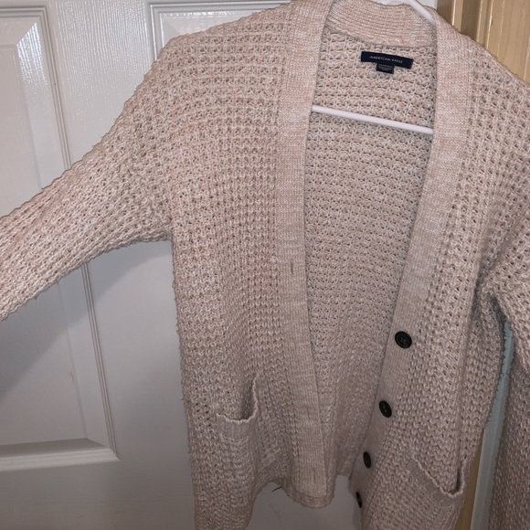 AE cardigan with black tortoise buttons. Shorter length, but still cute with jeans. Fits like XS in length but S in arms. The arms are slightly ballooned when on.