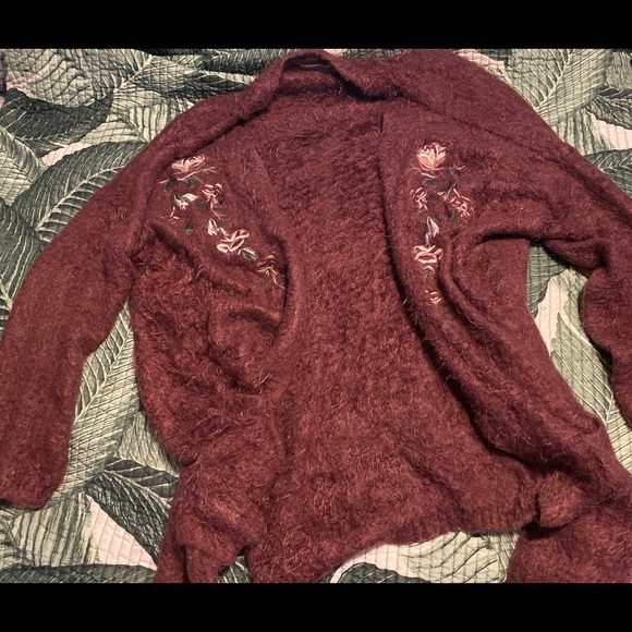 Very cute fuzzy long sleeve cardigan with embroidered flowers