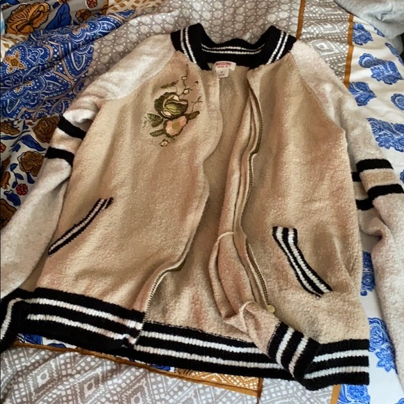 In very good condition! No holes, rips, or tears! Lightweight, two pockets in the front! Very stylish design and mix-match of colors! Flower design on the left shoulder area! Has a zipper!