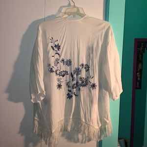 This is a white cardigan with blue floral patterns. It is super light and pairs well with a tank top.