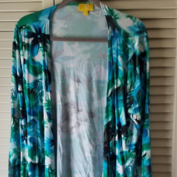 Lovely tropical feel to this casual lightweight cardigan--perfect for summer. 95% Rayon/5%Spandex.