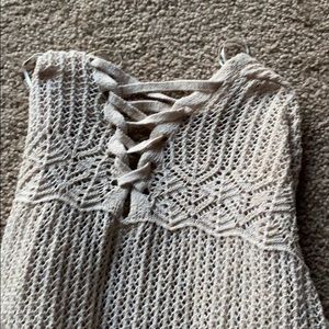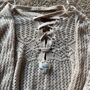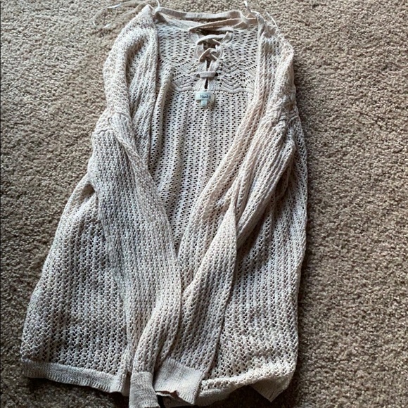 Super cute and comfy tan/cream cardigan with a cross cross design on the back. Perfect for fall!