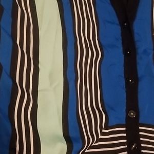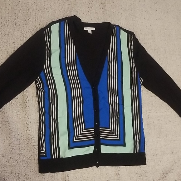 Geometric block in white, mint, and blue is Nylon, long sleeves and back of cardigan is cotton, v-neck, button down