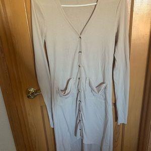 High low lightweight cardigan in excellent condition. This is labeled a small, but could also fit an an XS. I found that the arms were a bit too tight on me. I normally wear between a S-M in cardigans.