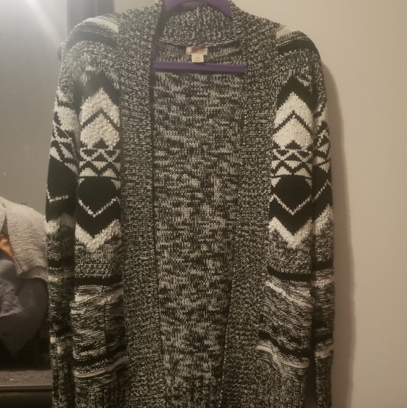 Only worn wonce. Super cute, heathered black and white cardigan. It has an Aztec print going down the sleeves and on the pockets. Bought it at Target. Size Small.