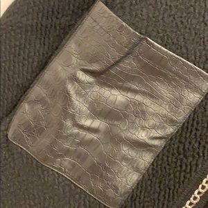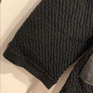 Long, open cardigan sweater with faux leather pockets.