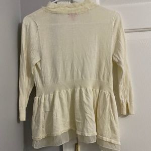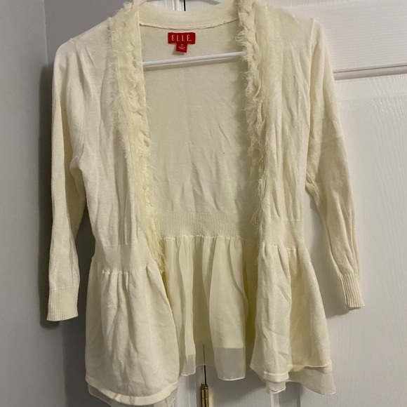 Cream sweater with ruffles. There is a clasp/hook on the inside to close the bottom of the sweater. In great condition