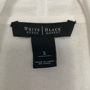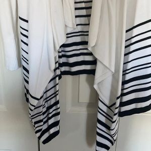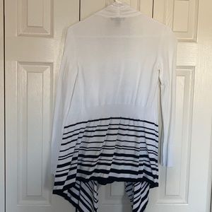 White House Black Market cardigan with longer detailed fabric in front, that you can tie. Looks great with black leggings and long boots!