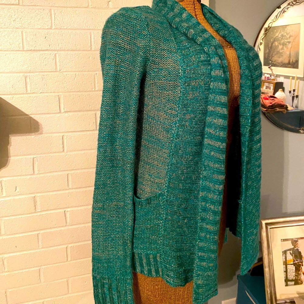 Teal Cardigan with ribbed front, oversized neck, 23” long, with 4” pockets