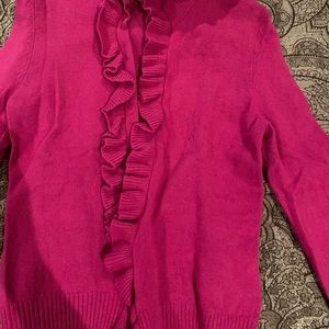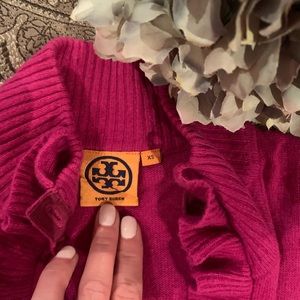 Tory Burch wool button down cardigan. Ruffles along front closure. Has some slight piling. Beautiful fuschia color 🛍💕