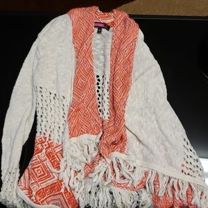 Lightly worn cardigan with fringe along bottom edging. Does not button or close up in front. Size M, juniors. Smoke and pet free home. Bundle 3 or more items, 15% off total.