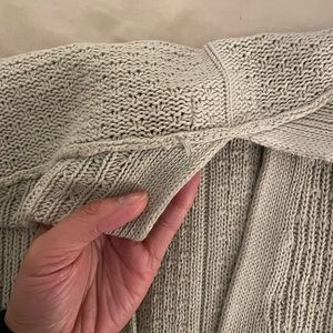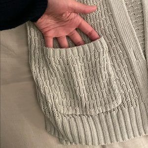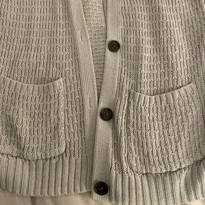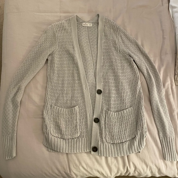 Size medium Hollister cardigan. A nice neutral beige color. Cute knit stitching, no holes or rips aside from the slight pull on the neck, as shown in photos. Light weight for mild temperatures.