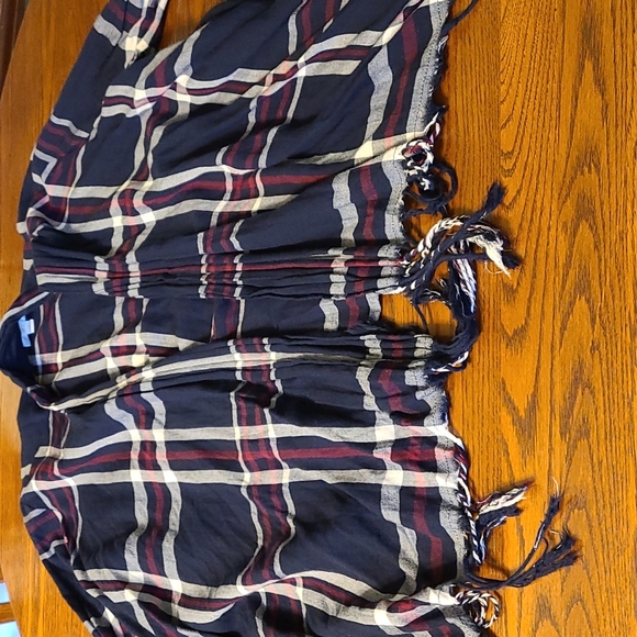 open with no buttons, long on the sides with fringe around the bottom front