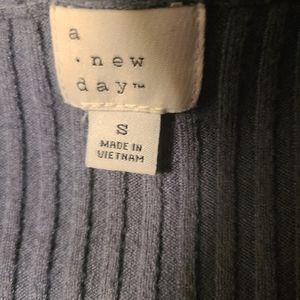 button front cardigan in a smoky blue color that pairs well with a multitude of colors. stretchy and soft material. gently worn, with no signs of damage.