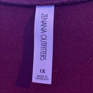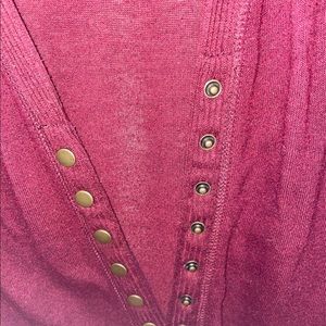 Maroon cardigan super comfy and has cute buttons. It can also be a shirt but it has a very low neckline. Fits like a large shirt or an XL cardigan.