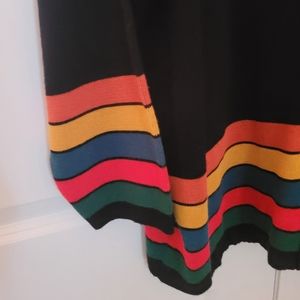 Black w/multi color stripes along the bottom. Great with a distressed pair of jeans.