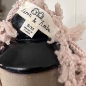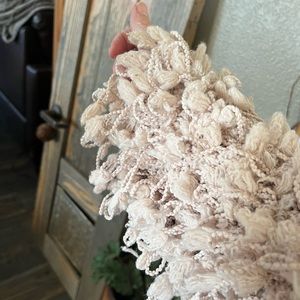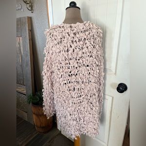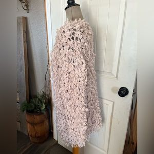 This cardi is a statement maker for sure! Super soft knit with tons of texture from Pom-Pom like tassels and loops to a fishnet like look , it’s imo a tan/ nude tone and yet in some lighting takes on more of a slight blush color ! Metal hook closure can be fastened or not So unique and just beautiful!