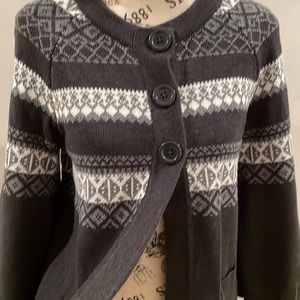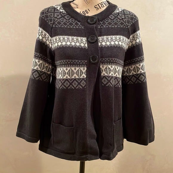 3/4 sleeves Fits similar to a shawl, 3 top buttons Very cute!