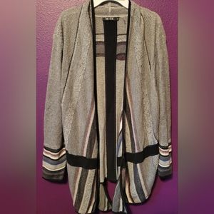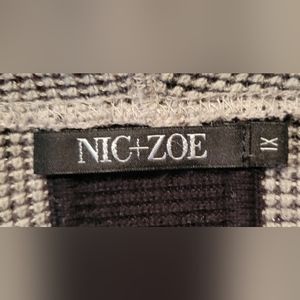 Nic+Zoe cardigan that is 1X runs true to size. Light gray with some shiny bits in it. Its a soft stretchy cardigan.