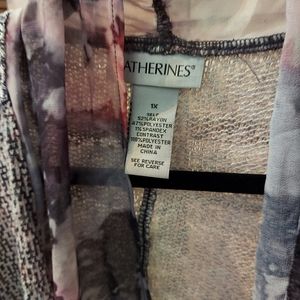 this cardigan has a beautiful colorful scarf sewn around neck and down each side