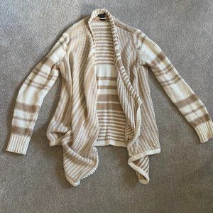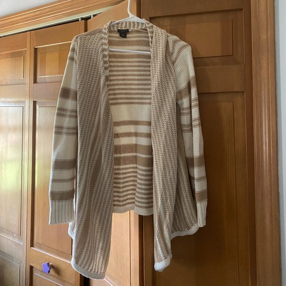 Long tan, cream cardigan. Is made of heavy and warm fabric. Sleeves are long.