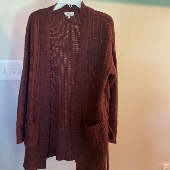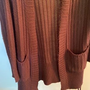 Super cute and soft, maroon color. Has a string on both side that’s tied. Great condition, no holes.