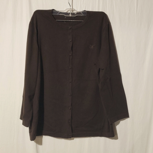 Brown box cardigan covered buttons. machine was and dry. pit to pit 20". shoulder to hem 24". 3/4 sleeve.
