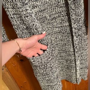 Warm & long cardigan, I am 5’2 & this comes to my calves! Thicker material & great quality!