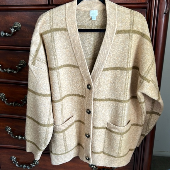 Cute, over-sized button cardigan. Front pockets. Cardigan is literally new. Worn a couple times. Too big for my liking. I’ve included pic with measurements. From pit to pit: 26” and shoulder to waist: 30”, Also added a close up of the color to give you a better idea.