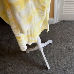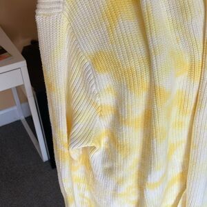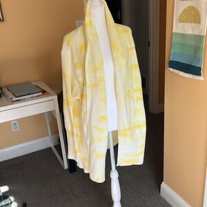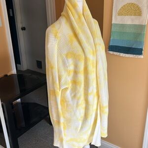 Woman’s cardigan with butter popcorn yellow colors mixed in. Calia brand Sz L. Stretchy bands around wrists. Tried on but never worn. Cozy and comfy.
