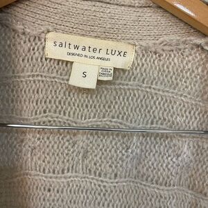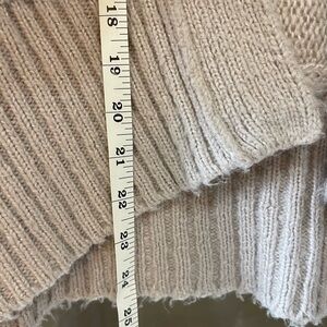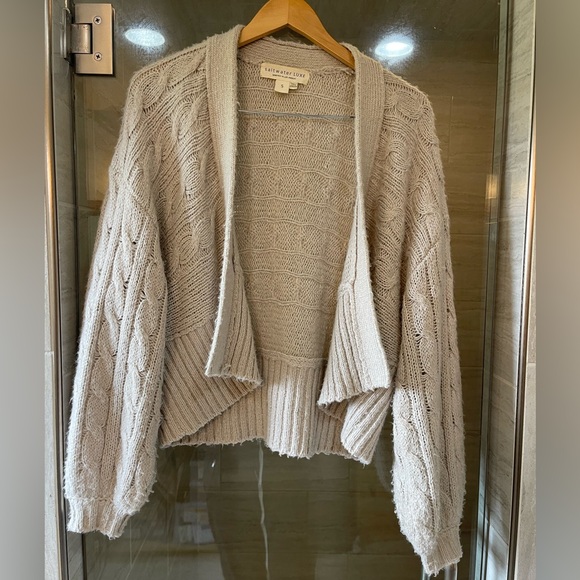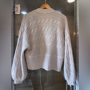 Puffy type sleeve, fits like a medium, cream/neutral color with grey tones (I’m bad at describing colors)