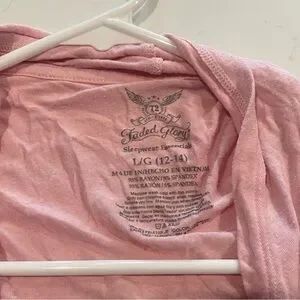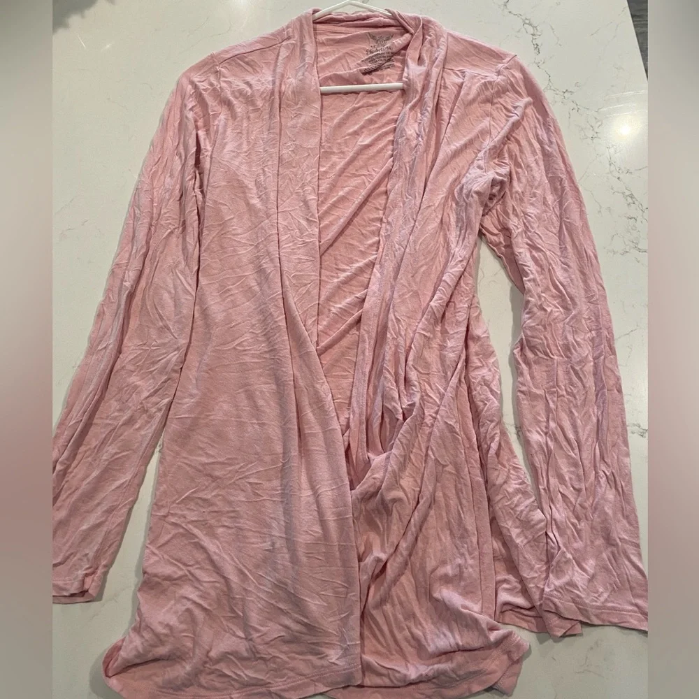Size large 12-14 light pink very light weight and stretchy long cardigan.
