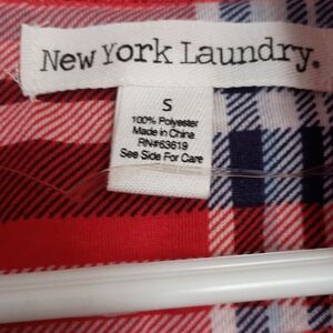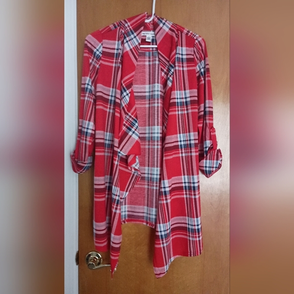 Polyester, lightweight, kimono type cardigan. Long sleeve, but adjustable roll up sleeves. Perfect for layering. Red plaid. Looks great with jeans. Too long for me as I am very short. Smoke free home. Just read that plaid shirts are an IN item this spring.