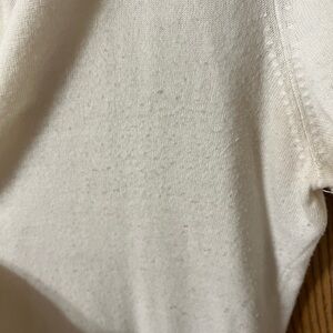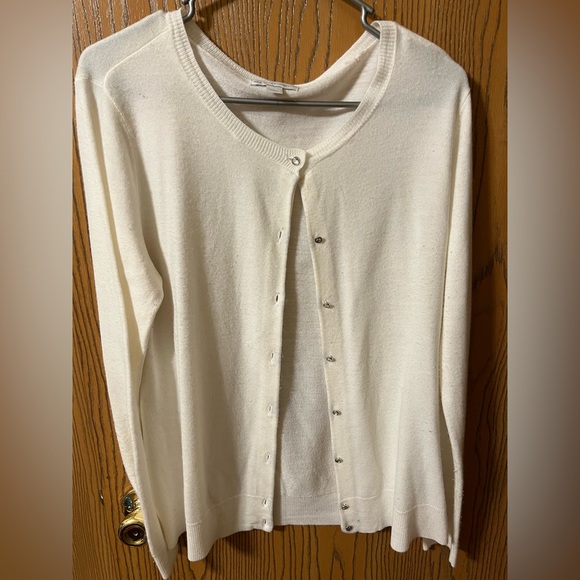 New York & Co cream color cardigan. Some pilling throughout the sweater since it’s a super soft acry material. Still in great condition. Worn minimally. Buttons have jewel accents. Size L