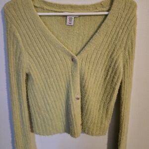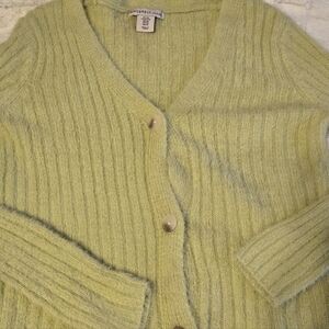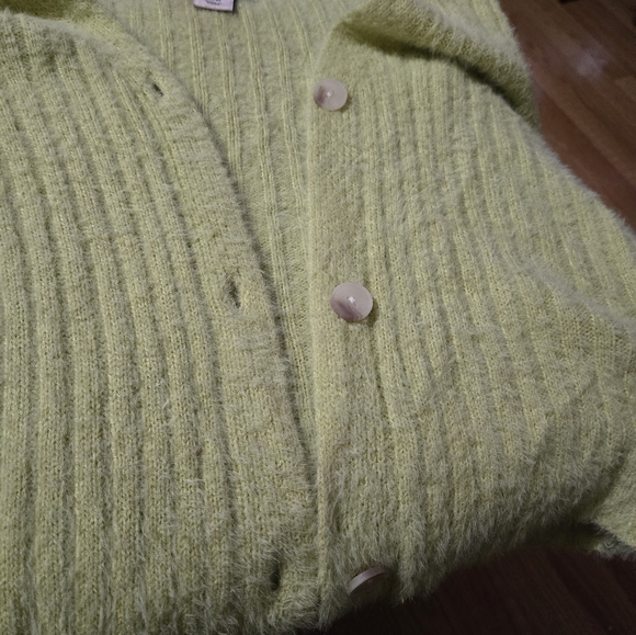This soft cardigan is a beautiful addition to any wardrobe. The pastel green color is perfect for spring. The blend of acrylic and nylon makes it both comfortable and durable. It's an ideal layering piece for cooler evenings. The cardigan adds a touch of elegance to any outfit.