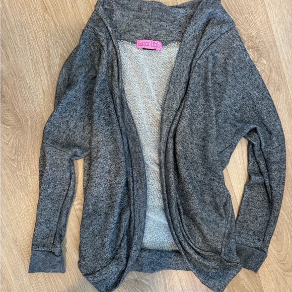 Embrace comfort and style with this cardigan, featuring a relaxed open-front design in a cozy gray knit. Perfect for layering, its soft texture and draped silhouette make it an ideal choice for casual outings or lounging at home. Size small gently worn