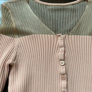 Light pink button-down cardigan with long sleeves and ribbed texture. Features a unique sheer golden mesh design at the shoulders and neckline, adding a stylish touch.