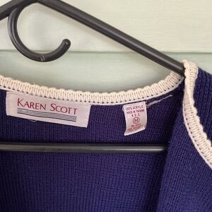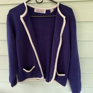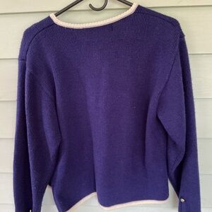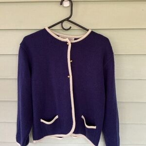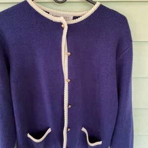 Blue knit cardigan with gold buttons. Two pockets with white knit on top of pocket. Sleeves have button accents.