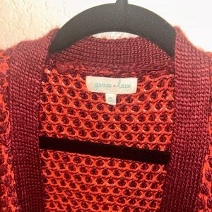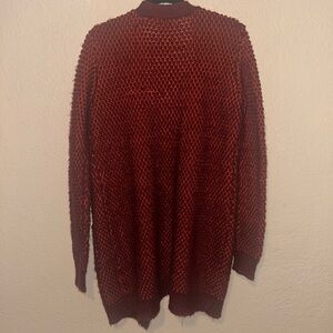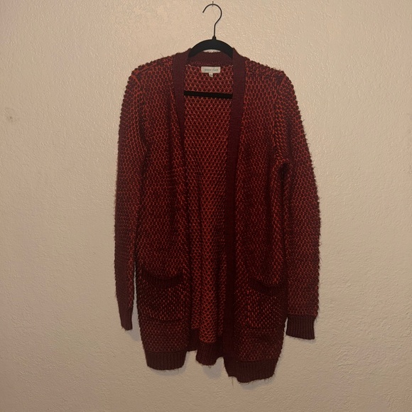 Popcorn knit open front cardigan with pockets. There is a visible snag on the back