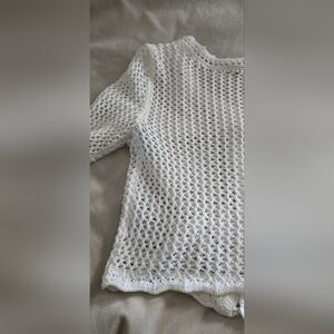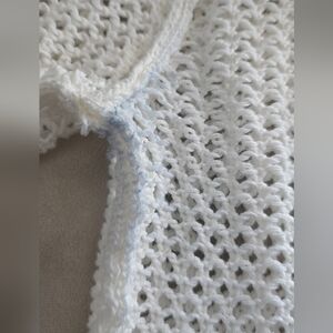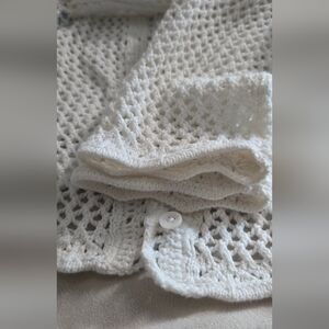 White cropped cardigan, very cute perfect for spring! I only wore it once but it has one small defect, a blue top I wore it with stained underneath the arm pit area seen in last 2 pics. Selling as is.