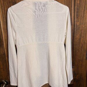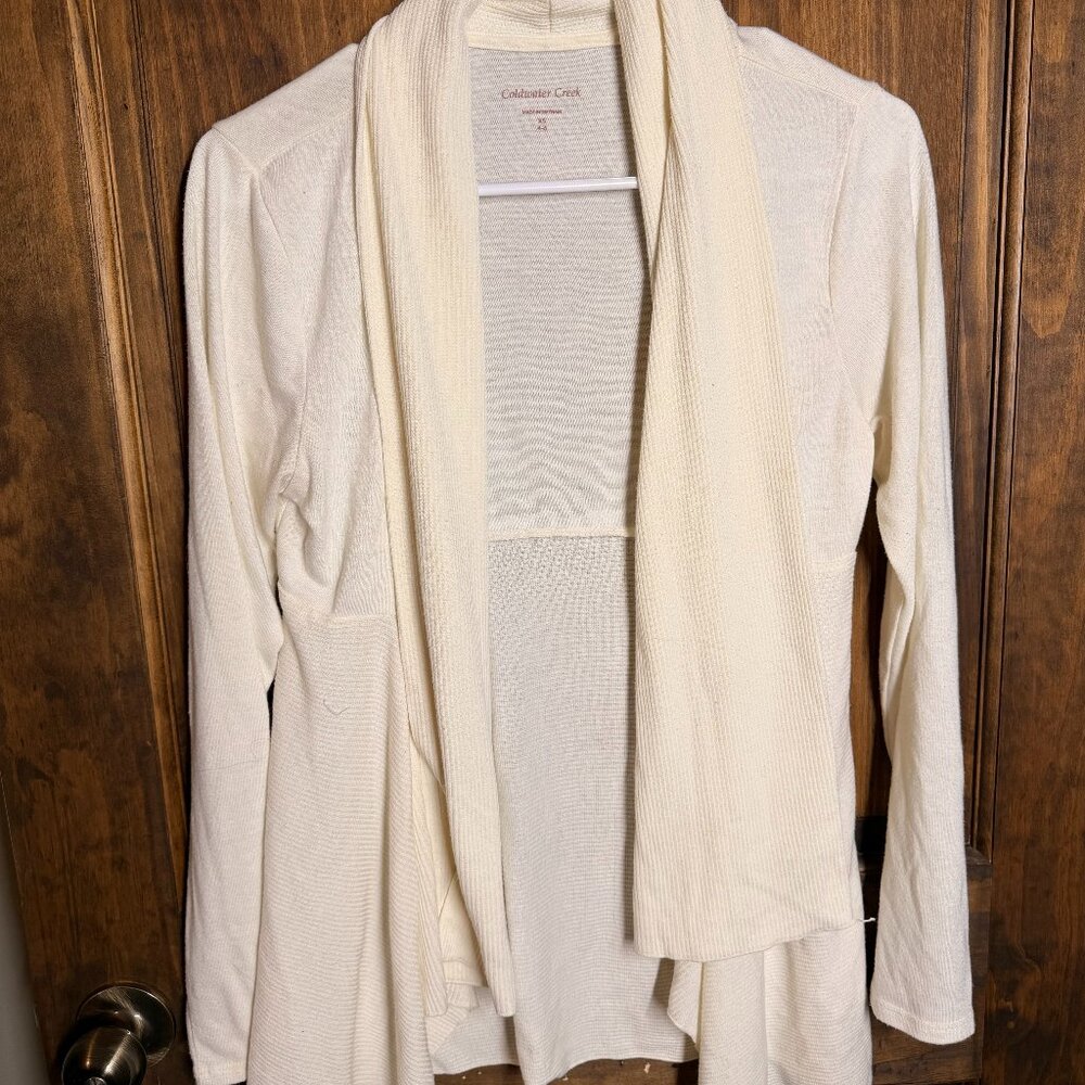 Coldwater Creek cream open-front cardigan with a soft, lightweight knit and a flattering draped front. Features long sleeves and a relaxed, flowy silhouette that layers easily over tops or dresses. Size XS (4–6) and perfect for casual wear, work, or cozy layering in cooler weather.